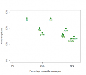 Relatie percentage vrouwelijke aanvragers (horizontaal) en honoreringskans (verticaal) Relatie percentage vrouwelijke aanvragers (horizontaal) en totale honoreringskans (mannen & vrouwen gezamenlijk) (verticaal) Het aandeel vrouwelijke aanvragers is het hoogst bij ZonMW (gezondheidswetenschappen) en MaGW (Maatschappij- en Gedragswetenschappen) en dit zijn precies de twee programma’s met de slechtste honoreringskans. Het aandeel vrouwelijke aanvragers is het laagst bij Natuurkunde (een bedroevende 11%), het programma met de hoogste honoreringskans.