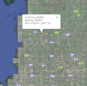 As a next step, I looked for appropriate sources for temperature data. The Centre for Environmental Data analysis has daily climate data for every 5 km-by-5 km square in the U.K., called the UKCP09 data set. From the grid, I selected the follow square, on the north side of Preston, to be representative for Lancashire.