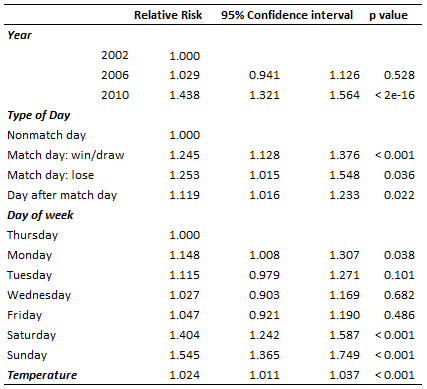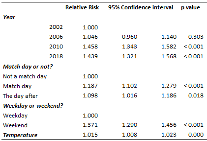 The interpretation of the 1.024 value for temperature, is that for each additional degree (Celsius), the risk grows by 2.4%. Just as in the 2014-paper, the increase in violence risk is very clear for match days. However, the estimates are smaller. Most notably, the estimate for what happens when England loses has become much smaller and now is about the same as for when England wins or draws. The reason is that England just happened to lose some games on exceptionally warm days. When they lost (after penalties) to Portugal on 1 July 2006, it was 27 degrees Celsius and on 27 June 2010, the day of the 4-1 defeat against the Germans, it was 26 degrees. (Note that these are the temperatures in Lancashire, not the temperatures of the location of the World Cup). The average temperature is about 20 degrees, so this additional “extra violent when England loses” effect could be due to temperature effects.