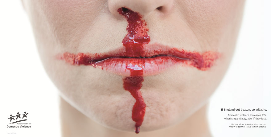 The small print is pretty small; it reads: “if England get beaten, so will she. Domestic violence increases 26% when England play, 38% if they lose”.